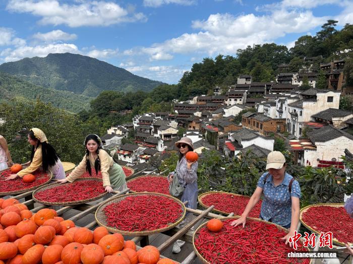 9月23日,适值华夏农人丰产节,江西婺源篁岭古村一片丰产情景。李韵涵 摄 丰产季节,村平易近将收成的农做物停止晾晒即于历久贮存,意为“晒春”,是华夏农业文化“春支冬躲”中的1环。 正在江西篁岭古村,“天无3尺仄”的天形让平易近居正在山崖上犬牙交错,房前屋后晒架上5彩奇丽的农做物,取黑墙黛瓦的徽派修筑产生比照,组成了1幅奇特的农雅景不雅。