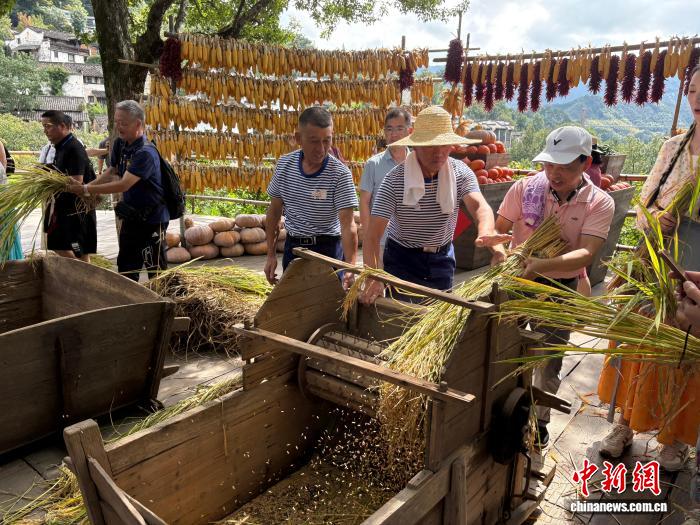 9月23日,正在江西婺源篁岭古村,乘客正正在体认挨谷机。李韵涵 摄 “固然此刻有好多进步的农业器具,但这类陈旧的挨谷机让尔感触感染到了先平易近的农耕聪慧。”去自北京的搭客王嘉正在领略挨谷机以后曲吸那是个“膂力活”。她显露,篁岭上冷繁华闹的丰产气氛,比收集上的像片活泼百倍。(完)